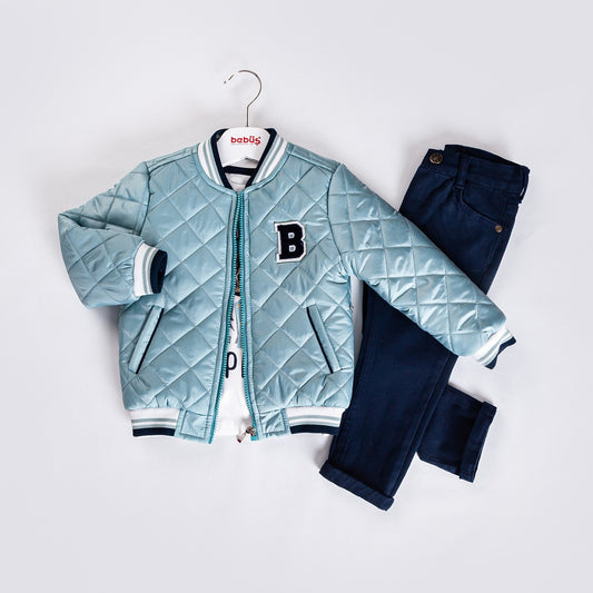 3-piece Boys Quilted Bomber Jacket with Logo, Shirt and Dark Blue Denim Pants