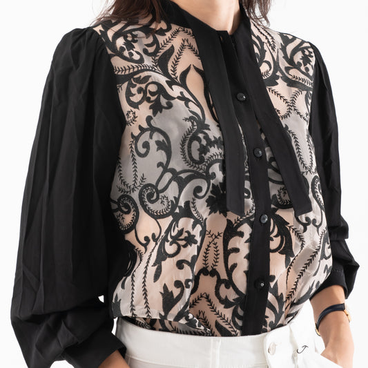 Black Blouse With Sheer Sleeves and Floral Emboridery
